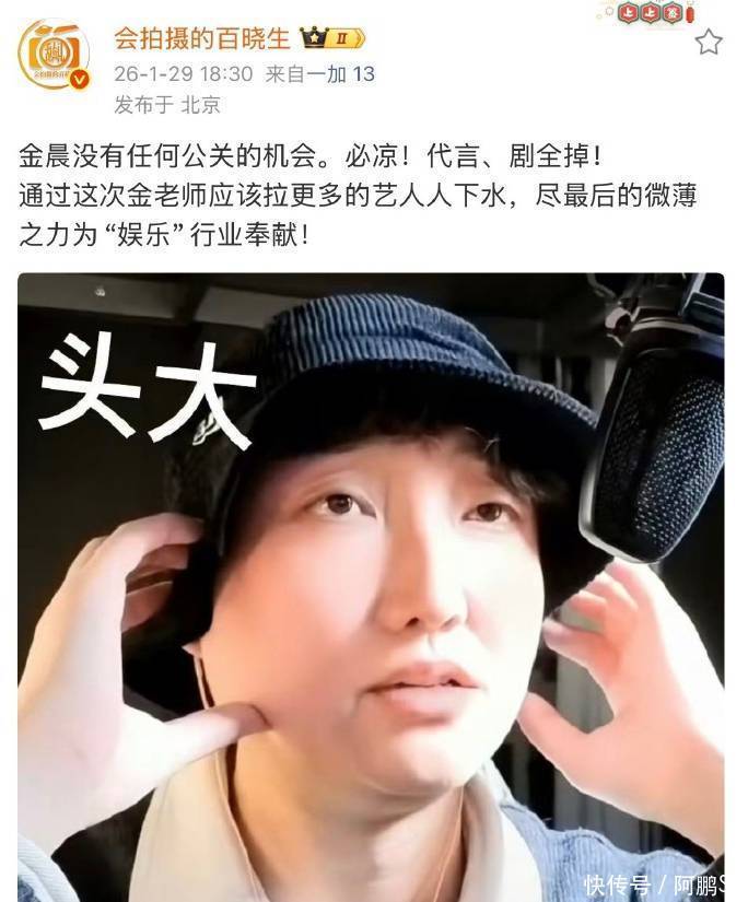 原来是博主“会拍摄的百晓生”发文:“曝金晨没有任何公关的机会。必凉! 代言、剧全掉! 通过这次金老师应该拉更多的艺人下水,尽最后的微薄之力为‘娱乐’行业奉献!”